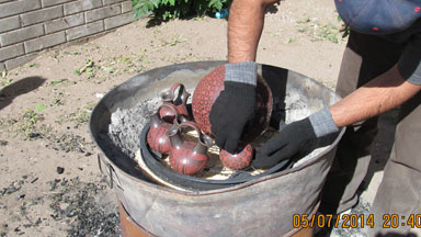 If the pots display a shiny black exterior, the pot has been coated with a mixture of kerosene and graphite, then polished with a stone to achieve the desired look. The artist will then handpaint, fire, and wash the pot.